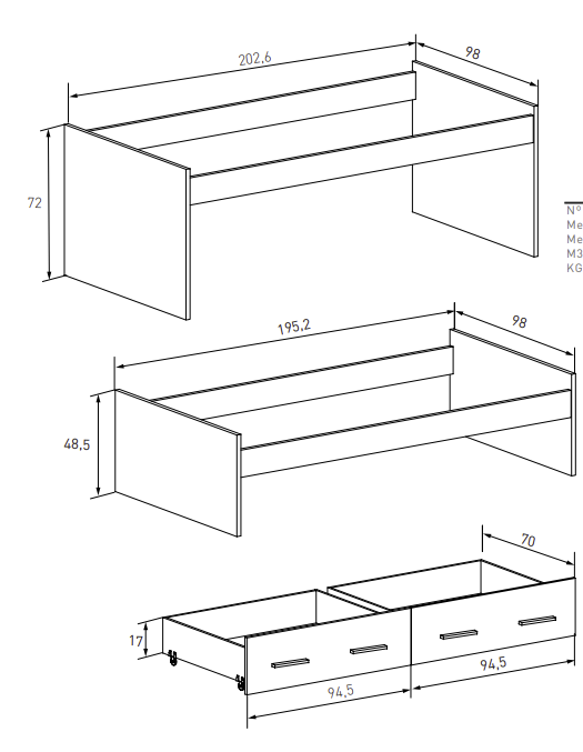 Cama: Altura: 72 cm | Ancho: 202,6 cm | Fondo: 98 cm